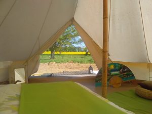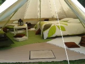 Les sols sont revêtus de tapis. Le mobilier est en bois avec petite table basse, miroir, décoration et éclairage d’ambiance. Effet “wahou” le glamping est en vogue et sait plaire !